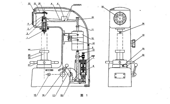 (1)、調整主試驗力的施加速度:手柄(16)置于卸荷位置,手把(13)轉到1471N的位置,將35-55HRC的標準硬度塊放在工作臺上,旋轉手輪(27)使硬度塊頂起主軸,加上初試驗力,拉動手柄(15)加主試驗力,觀察指示表大指針,從開始轉動到停止的時間應在1-8秒范圍內,如不符合,轉動油針(14)進行調整,反復進行,至到合適為止。