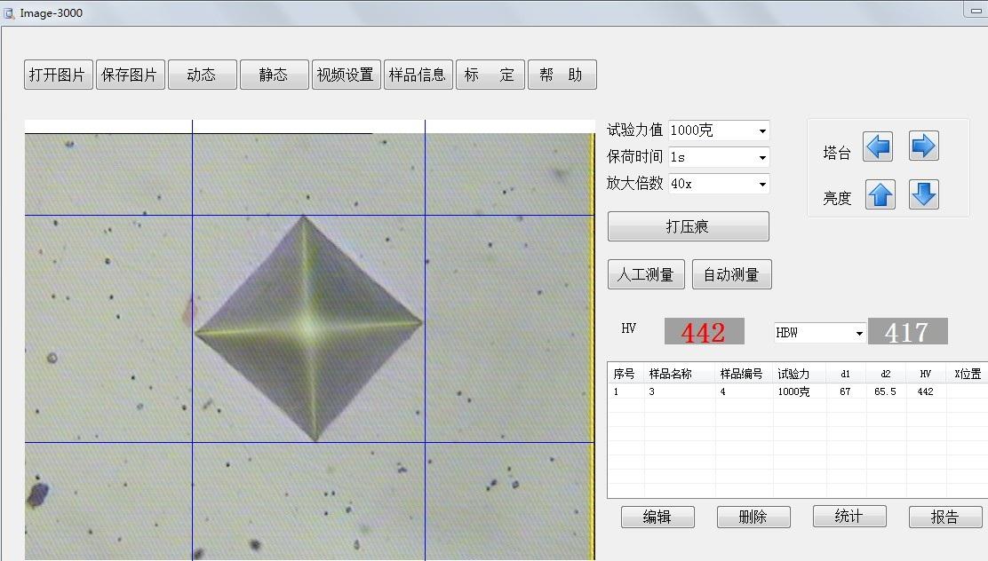 首先打開開關,放上試驗塊,打開光源,四向箭頭按向上箭頭,增加亮度,向上搖動調(diào)焦轉(zhuǎn)把,將試驗塊和物鏡距離大約2毫米。可以看清物塊表面,按下START(開始,測試)按鍵,物鏡會轉(zhuǎn)移成金剛石壓頭,然后金剛石壓頭向下 進行 加荷,保荷,卸荷 操作 (大約時間是在10~15秒) 然后,金剛石壓頭會轉(zhuǎn)成物鏡,目鏡為10倍物鏡為40倍,另一物鏡為觀察使用物鏡為20倍,